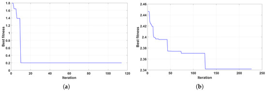Diagram of evolution curve in GA simulation. (a) Scenario with 8 areas. (b) Scenario with 20 areas.
