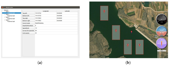 In the first experiment, there were 4 traverse tasks provisioned through the interface shown in Figure 14. In Figure 14a, each rectangular area is determined by the latitude and longitude values of four vertices, survey line space is 50 m, desired speed is 1.5 m/s and desired depth is 0m. In Figure 14b, the triangular arrow represents the start-point. The simulation result is shown in Figure 15a. In the diagram of the simulation, the width of a grid is 25 m. And the motion trajectory displayed in the deck monitoring interface is shown in Figure 15b. In the simulation, the optimized task sequence is 1-2-3-4 and the entry-point sequence is 3-3-3-1. In the experiment, the optimized task sequence is 1-2-3-4 and the entry-point sequence is 3-3-3-1. For this scenario, both results are optimal solutions. It can be seen that DSSA algorithm can work successfully and generate an optimization result in a physical AUV.