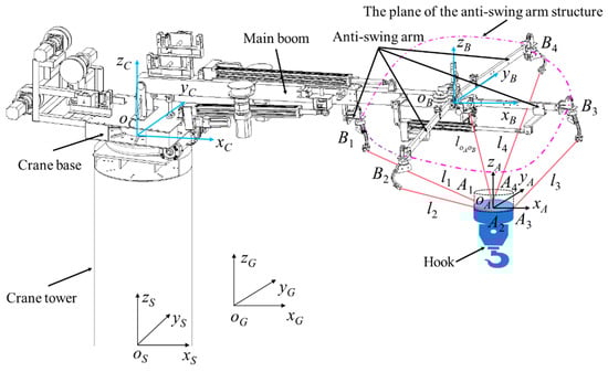 As shown in Figure 1, the marine crane flexible cable parallel anti-swing system mainly consists of the crane base, tower, main crane boom, anti-swing arm, hook and payload. The inertial coordinate system is oG–xGyGzG, the crane base coordinate system is oS–xSySzS, and the crane boom slewing coordinate system is oC–xCyCzC. The plane coordinate system where the anti-swing arm structure is located is oB–xByBzB, and the dynamic plane coordinate system in which the payload system is located is oA–xAyAzA. Bi (i = 1, 2, 3, 4) is the fixed anchor point. In robotics, the fixed anchor point refers to the cable guide pulley and fixed seat with rotational degrees of freedom; the rotation axis of the cable guide pulley’s circular surface coincides with the direction of the incoming rope; and its tangent point position remains unchanged when the rope is being retracted or released [32,33]. This refers to the connection point between the i-th anti-swing cable and the anti-swing arm structure. Ai (i = 1, 2, 3, 4) is the connection point between the i-th anti-swing cable and the plane where the payload system is located, also known as the dynamic platform connection point. is the main sling of the marine crane. The attitude description of the moving platform is expressed in terms of the Euler angles of rotation around the x-axis, y-axis, and z-axis of the inertial coordinate system in turn, and conforms to the right-hand rule.
