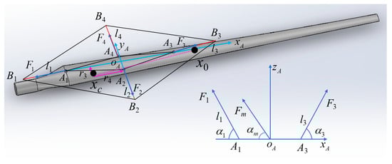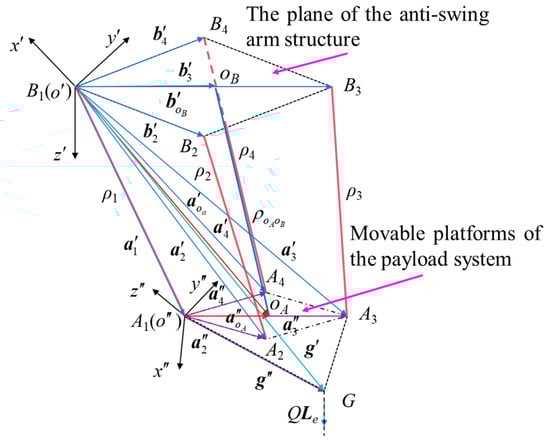 The vectors pointing from the origin oB of the plane coordinate system oB–xByBzB where the crane anti-swing arm structure is located and the origin oA of the plane dynamic coordinate system oA–xAyAzA of the payload system to the respective anti-swing cable connection points are defined as bi and ai, respectively. Thus, and can be obtained, and at the same time, the length of each anti-swing cable can be expressed as,