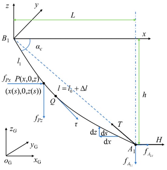 Since the four anti-swing cables in the marine crane flexible cable parallel anti-swing system are symmetrical in three-dimensional space, only one anti-swing cable is selected for the static modelling analysis. In addition, when the horizontal span of the anti-swing cable is large and the height difference is small, the anti-swing cable will generate obvious deformation due to the wind resistance and its own gravity, resulting in a catenary phenomenon. Therefore, the static catenary model of the anti-swing cable, considering its own gravity and elastic deformation, is shown in Figure 3. L is the horizontal span of the anti-swing cable, h is the height difference between the anti-swing cable connection points A1 and B1, αc is the inclination angle of the anti-swing cable, and the anti-swing cable l1 is located in the oB–xBzB plane. H is the horizontal component of the tension T of the anti-swing cable, and ds is the microelement of any length of the anti-swing cable.