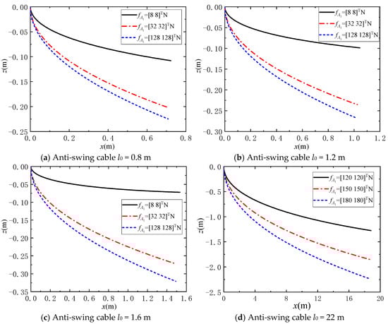 Under the influence of various marine environmental excitations and unknown disturbances, the payload in the flexible cable parallel anti-swing system will swing. Therefore, a static analysis of the catenary model of the anti-swing cable in the flexible cable parallel anti-swing system of the marine crane is carried out. The parameter information of the anti-swing cable is presented in Table 1. The initial tension values of the anti-swing cable are fA1 = [fA1x fA1y]T = [8 8]TN, fA1 = [fA1x fA1y]T = [32 32]TN, and fA1 = [fA1x fA1y]T = [128 128]TN, respectively.