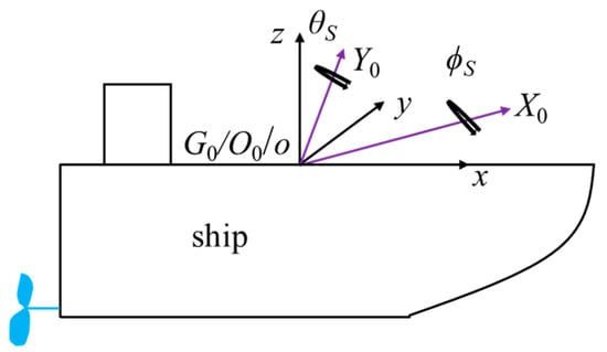 In Figure 5, the coordinate system of the ship in the static environment is o–xyz, the coordinate system under rolling and pitching excitation is O0–X0Y0Z0, the centre of gravity of the ship is G0, and the coordinate system origin o and O0 coincide with the centre of gravity G0. In deriving the coupled motion equations of the ship under rolling and pitching excitation, the following assumptions are made.