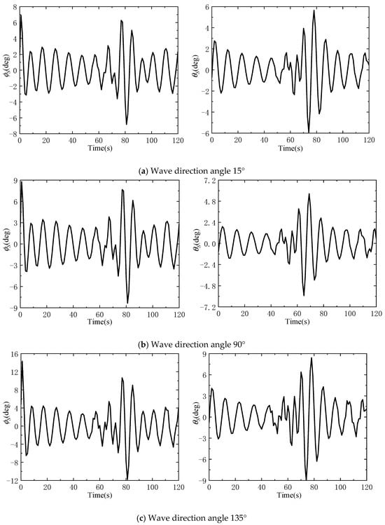When the marine crane is used for lifting operations at sea, the ship is actually in a static environment. Therefore, taking the ship’s speed as 0 kn, the simulation analysis of the wave inclination angle, roll angle, and pitch angle is carried out under the wave direction angle of 15°, 90° and 135°, respectively, and the results are shown in Figure 6a–c. As can be seen from Figure 6a–c, as the wave direction angle increases, the ship’s effective wave inclination angle under the coupled action of roll and pitch also increases also increases, and the excitation effect on the ship is also enhanced. It can be seen from Figure 7a–c that, as the wave direction angle increases, the ship’s roll and pitch angles also increase.