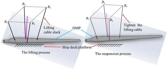 Over the past century, with the continuous acceleration of human exploration of marine resources and the rapid development of the marine economy, the characteristics of offshore lifting operation scenarios, lifting objects, and lifting methods of marine cranes have diversified. In other words, marine cranes have not only been used to lift goods, but have also been involved in marine scientific research using AUVs (Autonomous Underwater Vehicles) and in offshore wind turbine lifting and docking operations for new energy applications. At the same time, the lifting objects have evolved from point-mass payloads to distributed mass payloads (DMPs), and the lifting methods have evolved from using a single lifting cable to multiple lifting cables. For example, the Haliade-X 12 MW wind turbine has a total height of 260 m, a blade length of 107 m, and a nacelle and rotor weight of 825 tonnes [1]. It was lifted and installed using an ultra-large offshore floating crane equipped with a parallel mechanism of multiple flexible cables. This DMP with an oversized geometric structure and mass distribution inevitably encounters wave excitation and wind disturbance during lifting operations, and then generates swing, which poses a major threat to the safety and efficiency of marine crane lifting operations.