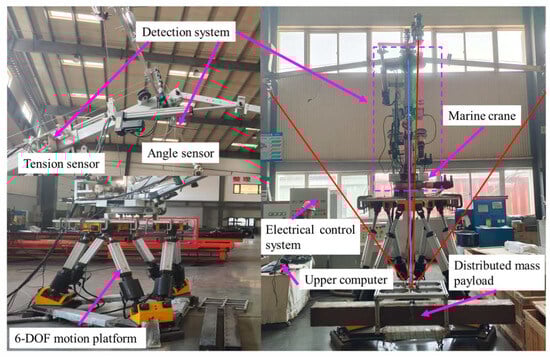 The scaled-down experimental platform for the parallel anti-swing system of marine cranes is shown in Figure 11. It primarily consists of a six-degree-of-freedom motion platform, a scaled-down crane prototype, flexible cables (such as high-strength steel wire cables), driving devices (such as electric reels for controlling cable extension and retraction), a detection system (including tension sensors and angle sensors for monitoring system status), an electrical control cabinet, a control system, and a special spreader. The anti-swing system works as follows: anti-swing arms are installed at the front, rear, left, and right positions of the main boom, and the anti-swing cables are connected to the spreader/payload from four spatial directions via pulleys. Under the motion excitation of the ship’s six-degree-of-freedom motion platform, the upper computer receives tension signals from the anti-swing cables and swing signals from the payload. It then sends out command signals, which control the retracting and releasing actions of the anti-swing cables, ultimately suppressing the swing of the in-plane and out-of-plane angles of the DMP.