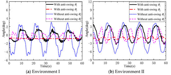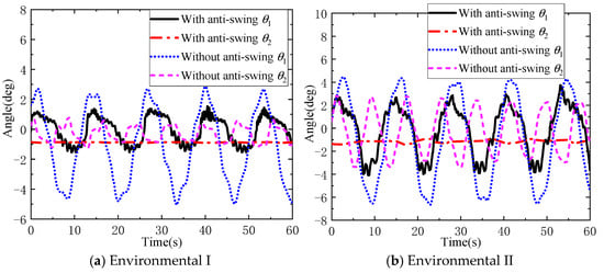 It can be seen from Figure 12a that, in environment I without anti-swing control, the maximum in-plane and out-of-plane angles of the DMP are −5.05° and −1.22°, respectively, while with anti-swing control, the maximum in-plane and out-of-plane angles are 1.54° and −0.90°, respectively. The flexible cable parallel anti-swing system has an anti-swing effect of 69.5% and 25.8% on the in-plane and out-of-plane angles of the DMP with regular geometric shape and mass distribution, respectively. It can be seen from Figure 12b that, in environment II without anti-swing control, the maximum in-plane and out-of-plane angles of the DMP are −6.64° and −3.41°, respectively, and when there is anti-swing control, the maximum in-plane and out-of-plane angles are −4.09° and −1.41°, respectively. Furthermore, the flexible cable parallel anti-swing system has an anti-swing effect of 38.4% and 58.6% on the in-plane and out-of-plane angles of the DMP with regular geometric shape and mass distribution, respectively. In summary, the flexible cable parallel anti-swing system has a good swing suppression effect on the DMP with regular shape and mass distribution.