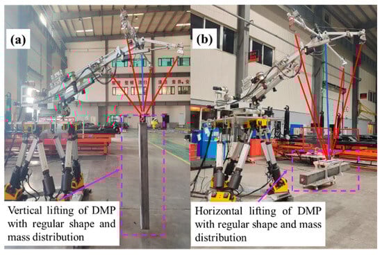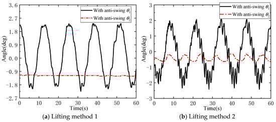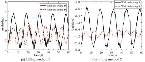 Next, anti-swing experiments are carried out on DMP with regular shapes and mass distributions under different lifting methods. The experimental process is shown in Figure 13a,b, and the results of the DMP anti-swing under the conditions of environment I are shown in Figure 14.