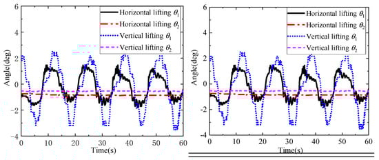 From Figure 14, it can be seen that, when using the flexible cable parallel anti-swing system for lifting DMP with regular shape and mass distribution, the maximum values of the in-plane and out-of-plane angles of the payload during vertical lifting are −3.517° and −0.571°, respectively. The maximum values of the in-plane and out-of-plane angles of the payload during horizontal lifting are −1.847° and −0.862°, respectively, with the in-plane angle decreasing by 47.5% and the out-of-plane angle increasing by 50.9% to 0.862°; the change is not more than 1°. Based on the above results, horizontal lifting has a better effect on reducing swing; therefore, for large DMP, horizontal lifting is generally selected, which can not only lower the centre of gravity, but also improve the anti-swing control effect to ensure the safety of lifting operations.