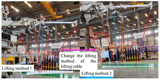 Figure 19 shows that, in lifting method 1, the maximum in-plane angle of the DMP is 3.91° and the maximum out-of-plane angle is 3.02°. Compared with lifting method 1, the maximum in-plane angle of the payload in lifting method 2 is 3.82°, with little change, while the maximum out-of-plane angle is 1.45°, which is a decrease of 52.0%. Meanwhile, it can be seen from Figure 15 that the use of lifting method 2 helps to suppress the out-of-plane angle swing of the DMP with irregular shape and mass distribution.
