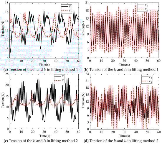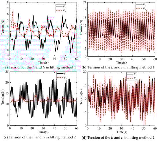 It can be seen from Figure 17 that, in lifting method 1, the maximum in-plane angle of the DMP is 2.33°, and the maximum out-of-plane angle is 1.25°, while in lifting method 2, the maximum in-plane angle of the DMP is 2.42°, and the maximum out-of-plane angle is 0.67°. From Figure 18 and Figure 20, it can be seen that the frequency of changes in the tensions of the anti-swing cables l1, l2, l3, and l4 is higher in lifting method 2 than in lifting method 1. Due to the influence of the mass distribution and geometric structure of the DMP, F1 becomes larger, F3 becomes smaller, the tensions F2 and F4 show a tendency to become larger, and the fluctuation of the magnitude of the tension force increases in lifting method 2.