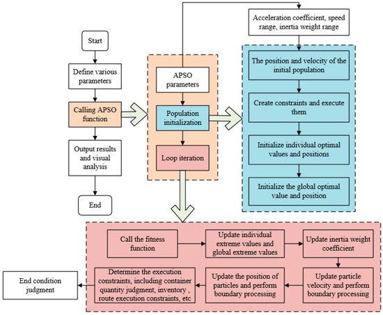 Additionally, the traditional particle swarm optimization (PSO) algorithm performs well in some problems but still faces challenges such as premature convergence, high parameter sensitivity, high-dimensional problems, and multimodal limitations. In order to enhance the algorithm’s ability to perform global search in the initial stage and local search and convergence in the later stage, this paper adopts adaptive strategies to improve the traditional particle swarm algorithm, making it more in line with the characteristics of optimizing empty container transportation problems. The algorithm flowchart is shown in Figure 2.