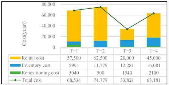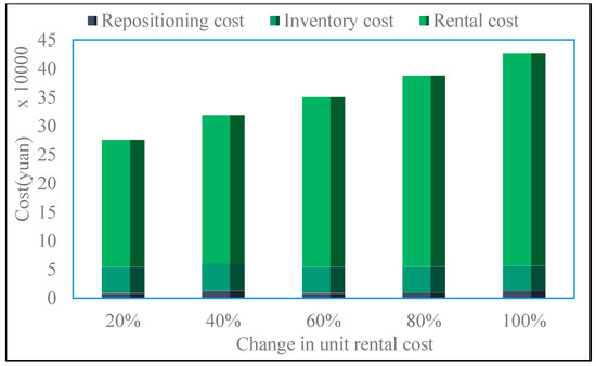 As shown in Figure 6, the cost of empty container management increases with the increase in unit rental cost, and the two are positively correlated. At the same time, it can be observed that regardless of the magnitude of the change, the total cost of renting a container will account for over 60% of the total cost and even reach 80%. Through this experiment, it was found that for shipping companies, the cost of renting is much higher than that of repositioning and inventory. Although renting containers is inevitable, it is also necessary to reduce the renting volume through their own empty container inventory.