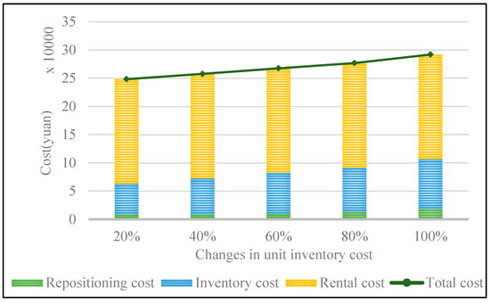 We conducted experiments to increase the unit inventory cost by 20–100%, similar to the unit rental cost. The results are shown in Figure 7. The calculation results demonstrate a positive correlation between the total cost of empty container management and the unit inventory cost. Due to the use of the (s, S) strategy, the inventory level of the shipping company at the port increases, and the increase in unit empty container inventory cost will further exacerbate the inflation of total inventory cost.