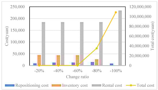 The maximum inventory capacity of a port is the fundamental guarantee for the implementation of the (s, S) strategy, and the setting of (s, S) is closely related to its value, which is the upper limit of the inventory threshold setting. The inventory of empty containers at the same port varies among different shipping companies. Therefore, to explore the relationship between the maximum inventory capacity of empty containers at the port and the total cost of empty container management, we conducted sensitivity experiments by reducing the initial maximum inventory capacity value by 20%–100%. The results are shown in Figure 8.