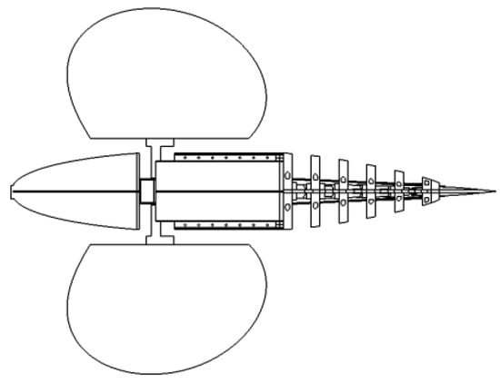 When combined with the morphological characteristics of the greenfin fish, the larger pectoral fins provide a guarantee for the pectoral fin propulsion mode, but they also produce a higher traveling resistance. The tail fin propulsion mode for the bionic greenfin fish robot’s propulsion speed and propulsion efficiency is much lower than the pectoral fin propulsion mode. As a result, the bionic fish robot designed in this project is primarily based on the pectoral fin’s water-skimming propulsion mode with a higher propulsion speed, while the caudal fin is primarily responsible for steering and stopping, completing the overall design of the bionic greenfin fish robot. Based on the morphological and structural composition of the greenfin fish, the bionic greenfin fish robot as a whole can be divided into four parts: head, body, pectoral fins, and caudal fins. Based on geometric integration and accuracy, function sharing, supplier capability, similarity of design or production technology, centralized modification, suitability for diversification, standardization, and convenience of association, the corresponding module elements are divided into corresponding sections, and all possible clustering schemes are considered. The division of specific modules is shown in Figure 2.