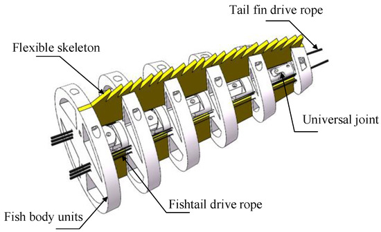 The fishtail part of the bionic greenfin fish robot is mainly composed of two parts: the flexible skeleton and the fishtail unit. The flexible skeleton and the rigid support in the fishtail unit are connected together by screws. The bending elasticity of the flexible skeleton determines the oscillation performance of the fishtail part, and it has to be less likely to break when the circular deformation occurs under force. A TPU thermoplastic polyurethane elastomer was chosen for the flexible skeleton. The fishtail structure is shown in Figure 4:
