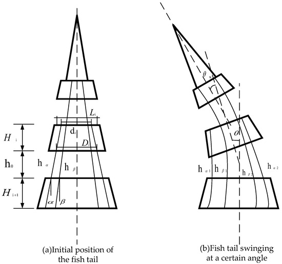 This paper uses a kinematic model-based control method for the tail fins, with the drive method being a tiller drive, thus pulling the rope to control the oscillation of the tail fin of the fish. In order to calculate the relationship between the control parameters of the fishtail fin and the rotation angle of the rudder, the paper simplifies the design parameters of the fishtail fin of the cable-pulling mechanism and gives a simplified schematic diagram of the structure, as shown in Figure 5. The diagram (a) indicates the initial position, while the diagram (b) indicates a certain angle of relative rotation. is the height of the fishtail unit; is the initial joint gap; is the initial line length of the fishtail through the joint gap; is the initial line length of the caudal fin through the joint gap; is the length of the elliptical short axis on the rear surface of the fishtail unit; is the center distance between the two line holes on the rear surface of the fishtail unit; is the center distance between the two line holes on the front surface of the fishtail unit; is the angle of inclination of the fishtail pulling line hole; is the angle of inclination of the fishtail pulling line hole; is the fishtail joint; is the angle of rotation of the caudal fin.