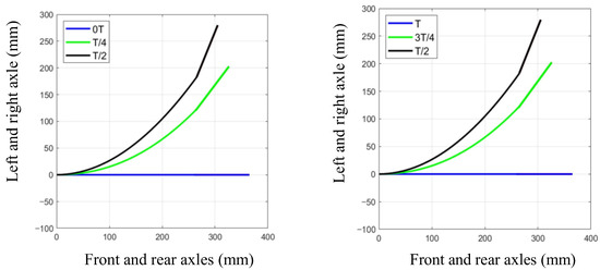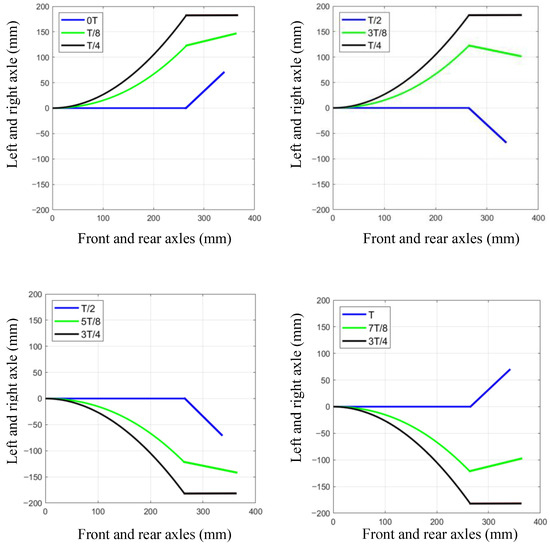 According to the simulation results take = 0, = 1, = 7.5°, = 15°, = 22.5°, = 30°, = 45°, = = = 0, = 90°, = 1. The oscillation of the caudal fin leads the phase of the 90° oscillation of the fishtail. Simulations were carried out in MATLAB to obtain a curve of the change in the mid-axis of the caudal fin of the fishtail in one cycle, as shown in Figure 8.