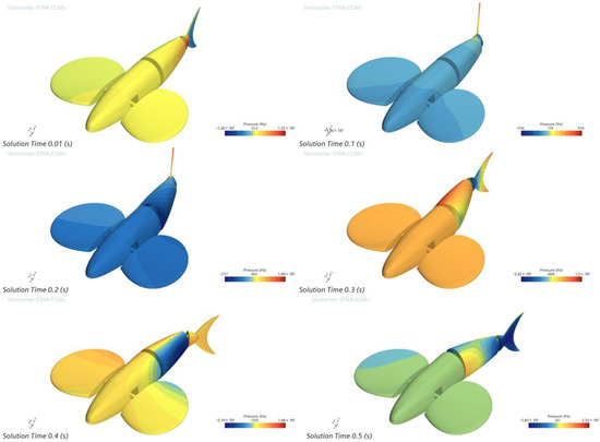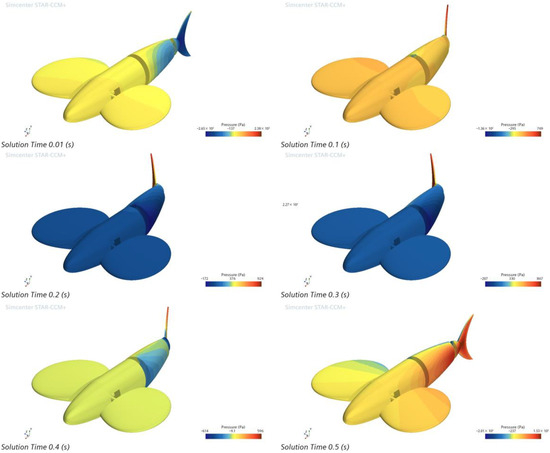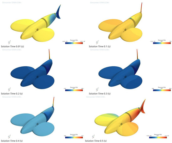 Using 2 Hz as an example, the tail fin negative phase oscillation time of one cycle is 0.5 s, and the surface pressure cloud of the bionic greenfin fish robot every 0.1 s is shown in Figure 15.