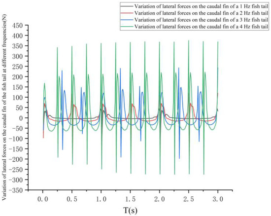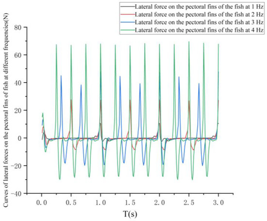 As can be seen in Figure 10, the lateral forces on the pectoral fins and caudal fins of the fish at the four frequencies also show a cyclic variation within 1 s. By analyzing the variation in the lateral forces on the pectoral fins and caudal fins of the fish within 1 s, the steering performance of the bionic greenfin fish robot at different frequencies can be analyzed.