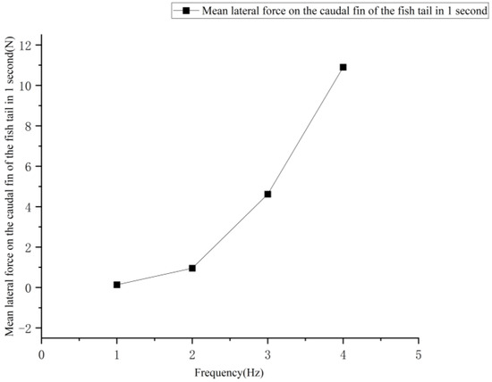 The average lateral force on the pectoral fins of the fish increased with frequency, but the work done by the average lateral force at 1 s was zero, which was attributed to the bigger size of the pectoral fins and the higher inertia of the bow rotation. The average lateral force on the caudal fin increased faster with increasing frequency in 1 s. The average lateral force on the caudal fin at different frequencies is shown in Figure 11.