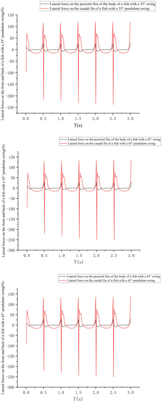 As can be seen in Figure 13, the lateral forces on the pectoral and caudal fins of the fish also vary periodically within 1 s at different caudal fin swings.