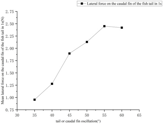 The average lateral force in 1 s on the pectoral fin of the fish also remained essentially around 0 for different caudal fin swings. The mean lateral force on the caudal fin increased with increasing caudal fin swing over 1 s. Figure 14 depicts the average lateral force on the caudal fin during various caudal fin swings.