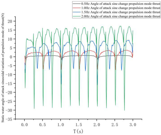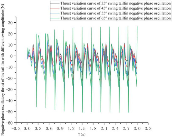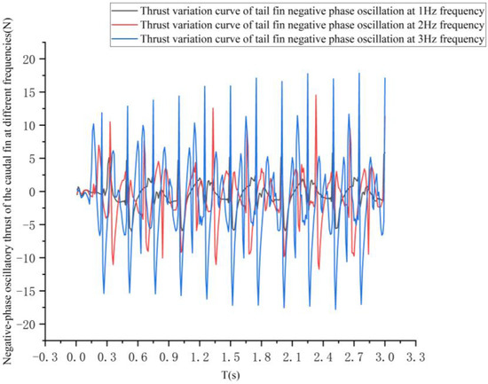 The thrust variation curves for the negative phase oscillation of the tail fin at different frequencies are shown in Figure 16.