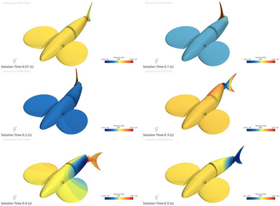 The tail fin of the bionic greenfin robot designed in this paper is mainly used for steering and emergency stop functions, and the steering performance of the tail fin is reflected by the difference between the lateral forces on the fish body and the tail fin when the fishtail is swinging. The fishtail steering relies on the one-way oscillation of the fishtail, which corresponds to the left and right oscillation frequencies of 0.5 Hz, 1 Hz, 1.5 Hz, and 2 Hz, respectively, 1 Hz, 2 Hz, 3 Hz, and 4 Hz. In the simplified model, the tail joint near the fish’s body is swung at an angle of 15°, the tail fin swing is chosen to be 35°, and the simulation time is 3 s. Using 2 Hz as an example, the fishtail steering oscillation takes a value of 0.5 s for one cycle, and the lateral force stabilizes after approximately one cycle. The instantaneous pressure clouds for 0.01 s, 0.1 s, 0.2 s, 0.3 s, 0.4 s, and 0.5 s are shown in Figure 9. The graphic shows the force on the fish’s body, particularly its tail, during a cycle.