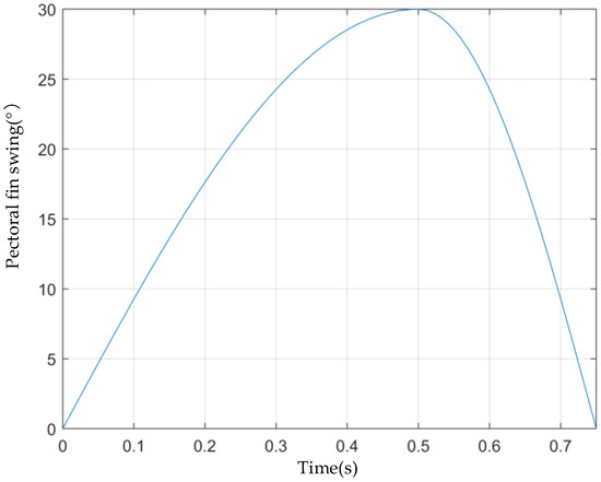 Through the analysis of the wave curve of the fish body, we find that the swing of the tail fin of the fish can also be controlled by a sinusoidal law. The steering control of the caudal fin can be thought of as the control of semi-propulsive motion, which creates both lateral and thrust force throughout the swinging process. The caudal fin generates substantially more lateral force than the pectoral fin, resulting in a steering torque that offers a power basis for the bionic robot’s steering action. The existence of the incoming force causes the bionic robot to follow forward motion while steering, affecting the steering function. When there is a positive phase difference between the fishtail and the caudal fin, meaning that the caudal fin swing lags behind the fishtail swing, the bionic robot’s effective work time in one swing cycle is increased, resulting in a greater propulsive force. As a result, when the bionic greenfin fish robot steers, the phase difference is set to zero degrees. Combining the simulation findings, take = 0, = 1, = 7.5°, = 15°, = 22.5°, = 30°, = 45°, = = = = 0°, = 1. We take half the period of the direct motion as the period of the steering motion and simulate it in MATLAB 2022b to obtain the curve of the change in the mid-axis of the tail fin of the fish in one cycle, as shown in Figure 7.