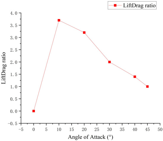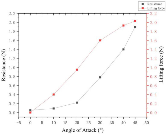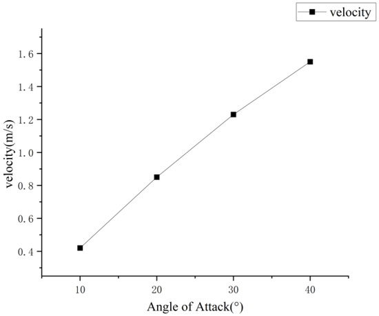 According to the analysis of the simulation results, the angle of attack exceeds 45° and the lift-to-drag ratio of the pectoral fin is close to 1. Therefore, the paper chose 10°, 20°, 30°, and 40° as the angle of attack variables to be studied. Specific relationships are shown in Figure 25.