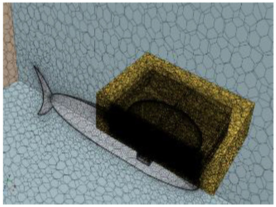 The width of the fish body is determined comprehensively according to the proportion of the size parameters of the greenfin fish and the need to minimize the size of the internal space. In this paper, we take a fish body height of 200 mm, a fish body width of 172 mm, a fish body length of 920 mm, a head length of 317 mm, a tail length of 306 mm, a tail length of 170 mm, a pectoral fin width of 319 mm, and a pectoral fin length of 438 mm. The numerical simulation of this model is carried out by using Fluent. Finite-element analysis is verified, the fluid material is selected as the default setting of water-liquid in the material library, the underwater turbulence state is considered, the standard form of the equation of the turbulence model k-ε is selected, and the non-equilibrium wall function is used to deal with the turbulence in the near-wall region. The boundary condition inlet velocity is set to 0.5 m/s. The SIMPLEC algorithm is used for pressure–velocity coupling, and the diffusion term is represented by a second-order center difference format. The static domain velocity inlet and velocity amplitude at the start are set to 0.1 m/s. Other settings remain constant.