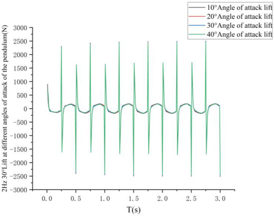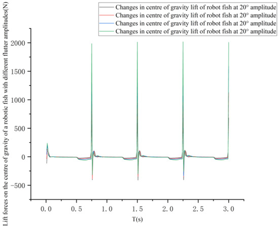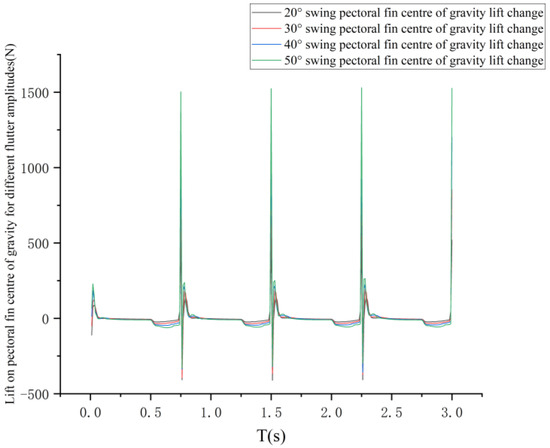 The curves of the variation in the lift force at the center of gravity and the center of gravity of the pectoral fin of the bionic greenfin fish robot and the variation in the thrust force at the center of gravity of the bionic greenfin fish robot for different flutter amplitudes are shown in Figure 37 and Figure 38.