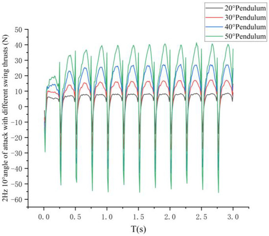 The effect of different flutter amplitudes on the pectoral fin propulsion performance of the bionic greenfin fish robot at 2 Hz frequency with a 10° sinusoidal variation in the angle of attack was selected as the swing angle oscillation variable for the study, and the simulation results are shown in Figure 30.
