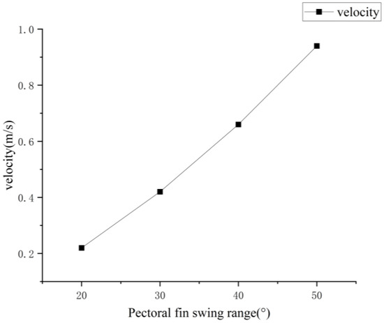 As shown in Figure 31, with the increase in the pectoral fin swing amplitude, the speed under the “-skimming” propulsion motion of the bionic greenfin robot also increases, and the propulsion speed increases at the highest multiplier when the swing amplitude increases between 20° and 30°. Considering the practical application, the pectoral fin “skimming” propulsion mode with a pectoral fin swing of 30° requires less motor drive and can maintain a good swimming efficiency and propulsion speed.