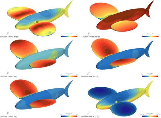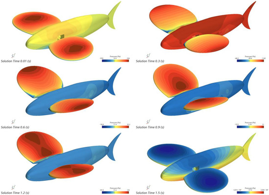 A major factor influencing the uneven fluttering motion of the pectoral fins is the flutter frequency. The higher the flutter frequency, the more flaps the bionic greenfin fish robot will carry out in a limited amount of time, with a corresponding reduction in the time taken by the robot fish to make monitoring position adjustments. The 30° flutter amplitude was chosen to study the effect of 0.66 Hz, 0.88 Hz, 1.33 Hz, and 2.66 Hz frequencies on the flutter motion, respectively. Taking 0.66 Hz flutter frequency as an example, the motion is 1.5 s for one cycle, and the instantaneous surface pressure cloud of every 0.3 s in one cycle is shown in Figure 32.