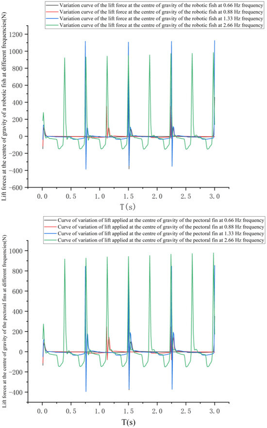 Lift variation curve of robotic fish and pectoral fin center of gravity under different frequencies.