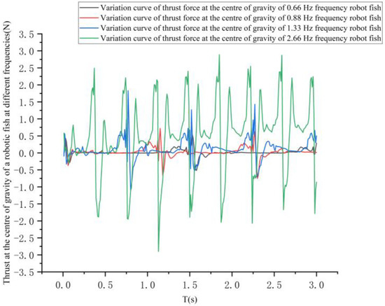 Curve of thrust change on the center of gravity of robotic fish at different frequencies.