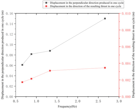 Displacement changes in the vertical and thrust directions during a cycle at different frequencies.