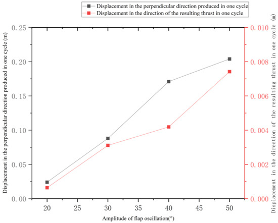 Displacement changes in the vertical and thrust directions during one cycle under different flapping wing amplitudes.