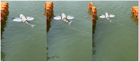 The previous paper completed the structural design and control method of the bionic green fin fish robot, as well as a hydrodynamic analysis of its performance, based on the conclusions of the previous paper on the bionic greenfin fish robot prototype preparation, the pectoral fins and the head portion of the fish to fill the float, that is, to regulate buoyancy, but also waterproofing of the space. The bionic greenfin fish robot’s construction featured a photosensitive resin shell and a flexible TPU backbone. The final experiment was conducted in the lake. Figure 40 depicts images of the robotic fish’s swimming condition, shown in chronological order.