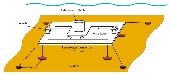 The main body of the underwater vehicle is a cylindrical structure mounted on a linear guidance system. The vehicle is towed by two motor-driven winches via steel wire ropes. One end of each steel wire rope is securely fastened to the winch drum to prevent relative sliding, while the other end is connected to a plate–ring tension sensor and ultimately fixed to the underwater vehicle. The motors, coupled with the winch drums via coaxial shafts through gear reducers for speed reduction, are equipped with incremental encoders to measure motor rotational speed. A wheel-based speed-measurement device is installed on the vehicle to monitor its velocity relative to the guide rail. The entire system is mounted on an adjustable underwater platform that remains horizontal during vehicle motion. A schematic diagram of the underwater vehicle is shown in Figure 1.