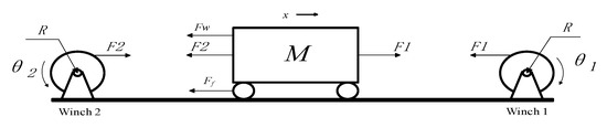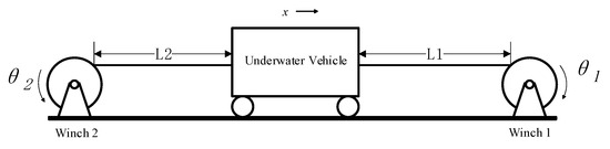where L 0 is the total length of the track. The underwater vehicle is in its initial position, x = 0 . At this time, the length of wire rope 1 is L 0 , and the length of wire rope 2 is 0. Therefore, the tension on the two steel wire ropes is expressed as follows: