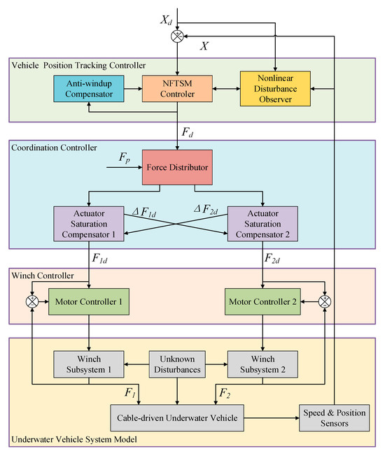 The rest of this paper is organized as follows: Section 2 briefly introduces the structure and modeling of the dual-winch-towed underwater vehicle system. Section 3 presents the dual-motor differential tension coordinated control strategy and the nonsingular fast-terminal sliding-mode control method integrated with a fuzzy adaptive nonlinear disturbance observer. Section 4 provides the simulation results. Finally, Section 5 concludes the paper.