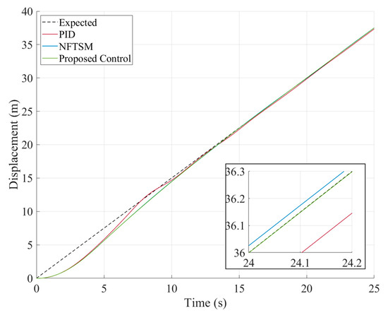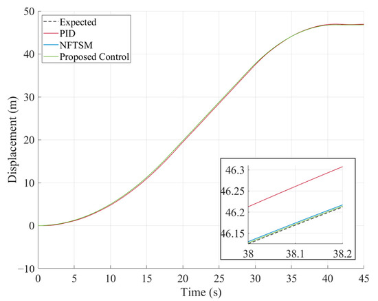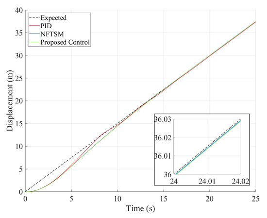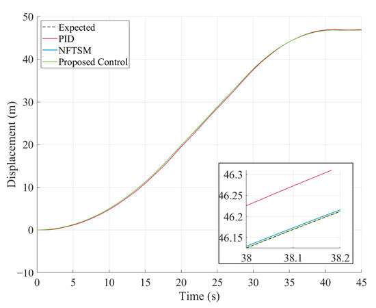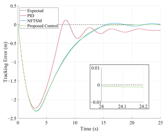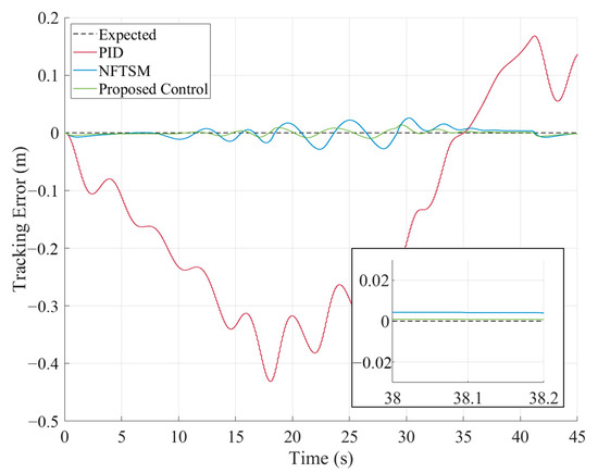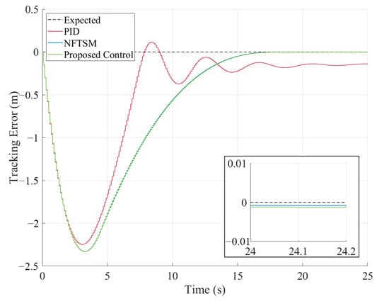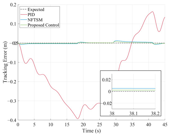 The results clearly demonstrate from Figure 21 that, for the proposed controller, compared to the baseline NFTSM without the disturbance observer, the absolute mean value of the tracking error decreased by 76%, the absolute maximum value of the tracking error decreased by 67%, and the mean square error decreased by 93.5%.