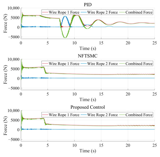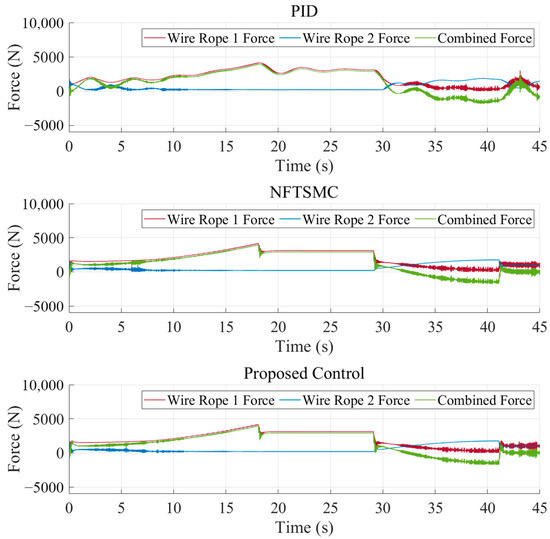 The results demonstrate that both methods are capable of realizing the desired control objectives. The convergence time and steady-state error of the proposed controller is significantly smaller than the PID cascade controller. From the comparison between Figure 7 and Figure 10, compared to constant speed tracking, the simulated experimental condition has a longer acceleration stage, which causes the tension on the steel wire rope to slowly increase, significantly reducing the shaking of the wire rope tension. This indicates that reasonable trajectory planning can significantly improve the smoothness of the motion process.
