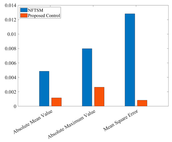 To further illustrate the differences in tracking performance between the NFTSM and the proposed control methods, a data comparison between the two approaches during the steady-state phase is provided. Among the three metrics analyzed, the mean absolute value (MAE) of the tracking error reflects control accuracy, the maximum absolute value of the tracking error indicates the worst-case deviation; the mean squared error (MSE) of the tracking error quantifies stability and fluctuation range.