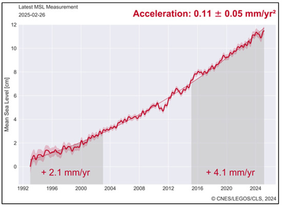 Satellite altimetry record of global mean sea level rise from 1993 to 2025 (from https://www.aviso.altimetry.fr/en/data/products/ocean-indicators-products/mean-sea-level/data-acces.html, accessed on 1 March 2025).