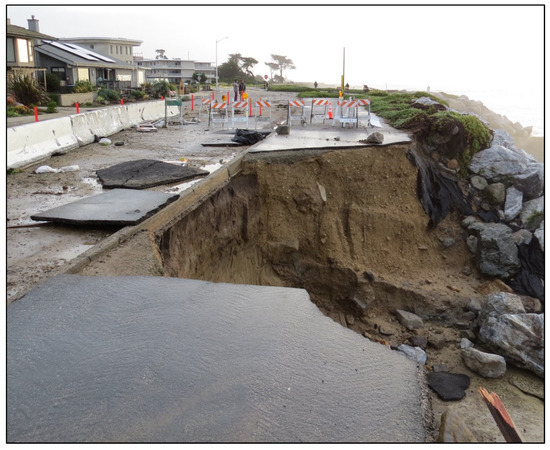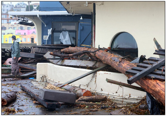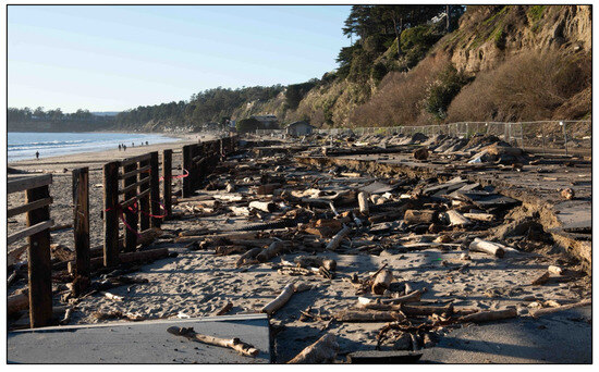 The first of what were to become three severe and damaging back-to-back coastal winters arrived on the morning of 5 January 2023, on the central coast, with the simultaneous occurrence of extremely large waves at the precise time of the highest monthly tides [29]. These are the conditions that have historically produced the greatest erosion and storm damage along the central California coast [28]. The January 5 event severely impacted about eleven miles of the northern Monterey Bay shoreline from Santa Cruz to Rio Del Mar along the inner bay (Figure 2), and larger-than-normal winter waves persisted for several more days. The closest wave buoy was anchored about 20 miles offshore and recorded significant wave heights of 8.6 m (28 feet), which arrived at the peak of the high tide. Although the predicted tide was 1.8 m (5.93 feet), the actual maximum verified high water in Monterey (the closest tide gauge) was 0.4 m (1.3 feet) higher (2.2 m). Major damage to low-lying public infrastructure and private homes and businesses occurred along about 18 km (11 miles) of coastline and included bluff retreat accompanying wave overtopping with the loss of significant portions of a pedestrian walkway/bike path and damage to a major oceanfront road (Figure 3), flooding and damage from logs and debris to shoreline homes and businesses (Figure 4), and the destruction of a state beach recreational vehicle campground (destroyed for the 8th time—Figure 5). Repairs and new seawall construction to protect the blufftop road in Santa Cruz have taken over two years at a cost of approximately $35 million.